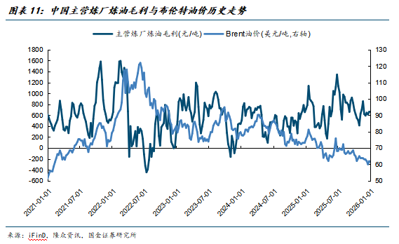 2025年全年原油中枢价格震荡下行,国内主营炼厂炼油毛利全年均价为708元/吨,较24年均价518元/吨同比明显有所提升。2026年国际原油市场主流机构普遍预期市场供给过剩,因此对于国际油价的预测在短期也是偏走弱;但是由于原油市场地缘冲突影响不断,地缘风险溢价支撑着原油中枢价格。因此预计未来原油的中枢价格仍将处于缓慢震荡下行的区间,叠加国内炼化“反内卷”与老旧装置出清,以及海外产能加速退出等等带来的行业格局的优化和景气度的提升,国内炼厂成品油的盈利有望在26年继续有所改善。