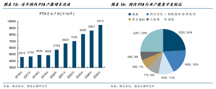 近几年来国内PTA产能增长十分迅速,有效产能从2019年的4869万吨增长至2025年的9473万吨,CAGR达到11.7%产能几近翻倍;当前国内PTA行业产能集中度较高,CR6达到75%。