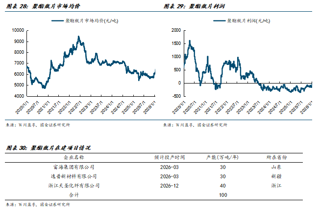 国内聚酯瓶片行业集中度较高,主要集中在逸盛、三房巷、万凯、华润等大型企业中,CR5达到78%。由于瓶片产品从23年以来亏损就较为严重,企业对于改善盈利的诉求同样较强,行业龙头的几家企业已经陆续开始协同检修减产,根据百川盈孚,截至2026年1月底,三房巷共停产和检修三条产线共145万吨/年;逸盛共停车和检修三条产线共150万吨/年;万凯共减产两套装置共120万吨/年等。从数据来看,龙头减产协同已经初步取得成效,2025年底以来,聚酯瓶片市场均价有所提升,产品毛利润也有所修复。聚酯瓶片行业未来新增产能也较少,预计仅在2026年有合计100万吨的新增产能,在龙头减产挺价和反内卷的环境下,瓶片的价格价差仍有望存在较大的修复空间。