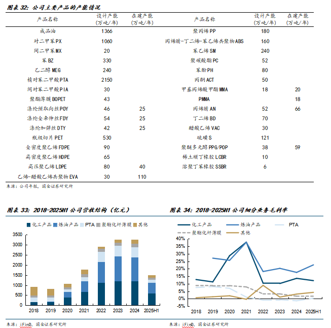 公司当前营收主要由炼油产品、化工产品及PTA产品贡献,2025年H1三项业务的营收占比分别为41%/35%/11%;得益于公司控股子公司浙石化的4000万吨/年炼化一体化项目,公司当前利润的主要来源于炼油产品和化工产品,2025年H1炼油产品和化工产品的毛利率分别达到了22.59%和12.08%。而PTA及聚酯业务由于前几年的“内卷式竞争”,处于亏损或薄利状态,但是随着扩产周期结束和反内卷背景,2025H1的业务毛利率有所好转,未来或将进一步改善。