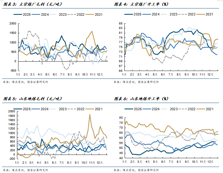截至2025年底,山东地方炼厂炼油毛利428元/吨,处于近五年内较低历史分位数;主营炼厂表现相对较好,炼油毛利为664元/吨,较去年同期有所改善。根据国内汽柴油价格的定价标准,国内成品油价格的调整以国际市场原油价格变动为参考(如布伦特原油价格),通常在每10个工作日的调价窗口内,根据前10个工作日的平均油价与上一次调价前的平均价格对比情况进行计算,当国际油价波动超过一定幅度时,国家发改委会发布汽柴油价格的调价通知。因此国内成品油价格走势与国际油价一致,但是明显具有一定的滞后性,由于独特的定价机制,当国际油价波动较小且缓慢下行的过程中,成品油的价差会因为调价时间的滞后性在一定的时间内有所扩大。在不考虑成品油需求剧烈变化对批发价格的影响外,原油价格缓慢下行的区间对于炼厂的成品油盈利是逐步有所改善的。