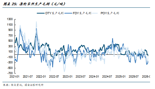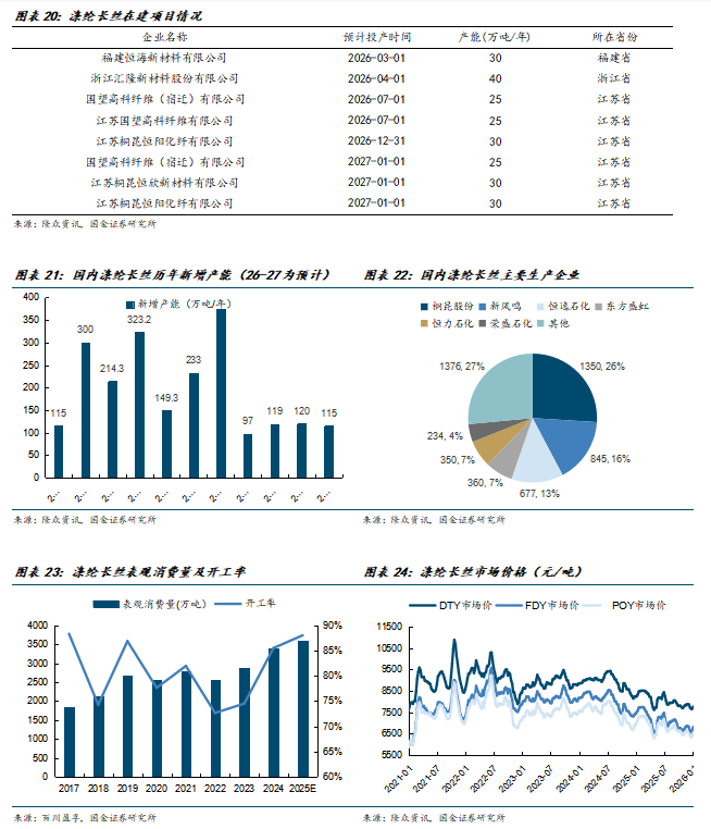 产品价差方面,长丝DTY/FDY/POY的生产毛利自2022年起便处于较差的情况,产品毛利绝大多数时间均处于亏损的状态,长丝企业持续多年承受较大的压力;当前来看长丝产品毛利仍处于较多亏损的情况,长丝企业提高盈利水平、扭亏为盈的需求极为强烈。未来在行业反内卷的背景下,龙头企业有望达成减产协同,来改善企业盈利情况;同时从供需角度来看,涤纶长丝扩产周期结束,未来行业新增产能有限,未来长丝产品的价格及价差均有望得到改善。