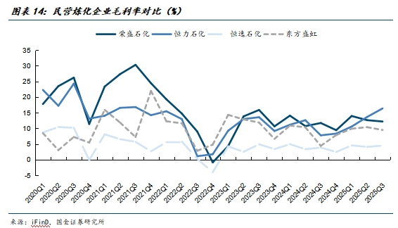 截至2025年底国内炼能已经达到9.73亿吨,已经接近10亿吨产能红线,26-27年仅有1500万吨在建的炼化产能。反内卷及老旧装置淘汰等政策有望加速推动炼油行业供给侧优化,炼厂盈利有望持续改善。公司控股子公司(持股比例51%)浙石化4000万吨/年炼化一体化项目于2022年初全面建成投产,是全国单体规模最大的炼化项目,具有较大的规模优势。凭借炼化一体化和分子炼油的优势,公司毛利率在民营炼化企业中较为领先,优势明显。公司2025Q3实现归母净利润2.86亿元,同比+1428%,主要来自于各产品价差修复,因此预计25年公司业绩将会有较大同比提升。