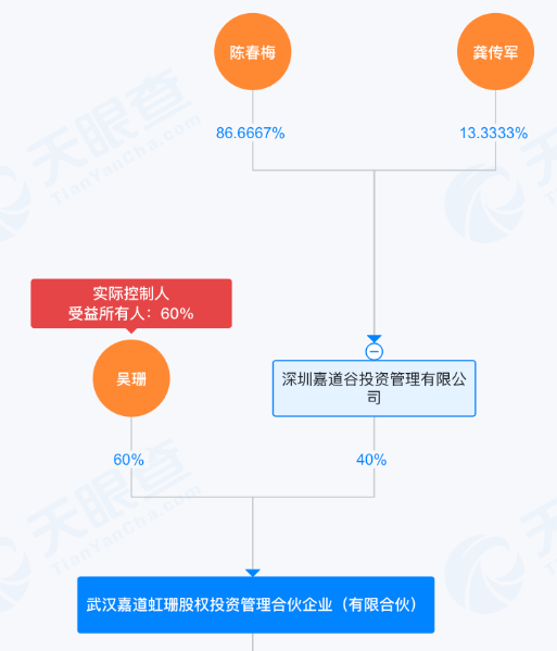 从股权穿透来看,汉江智联正是龚虹嘉布局久量股份的关键载体。这家成立于 2025 年 12 月、注册资本 8 亿元的企业,其普通合伙人是武汉嘉道虹珊股权投资管理合伙企业(有限合伙)(下称 “嘉道虹珊”),出资比例 1%。嘉道虹珊由吴珊持股 60%、深圳嘉道谷投资持股 40%,其中深圳嘉道谷投资由龚虹嘉之妻陈春梅持股 86.6667%、龚传军持股 13.3333%,法定代表人为龚虹嘉,且吴珊与龚虹嘉渊源颇深,不仅是其华中科技大学师妹,还在龚虹嘉、陈春梅投资的多家企业任职,同时担任中源协和董事。一系列股权关系背后,600 亿资本大佬龚虹嘉的入局脉络清晰浮现。