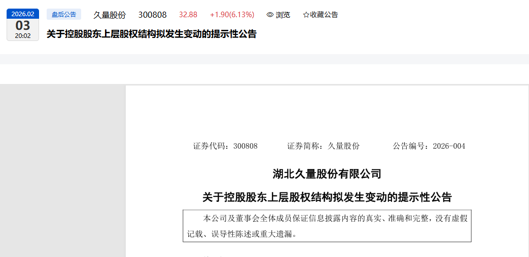 2026 年 2 月,久量股份(300808.SZ)披露的一则控股股东上层股权变动公告,让知名资本大佬龚虹嘉的身影出现在这家 LED 照明企业的股权图谱中。作为被 IDG 等机构称作 “中国最优秀的天使投资人” 的龚虹嘉,此次通过旗下投资平台间接入局,为业绩持续承压的久量股份带来了新的想象空间,而十堰市国资委始终保持上市公司实际控制人身份,这场国资与知名资本的合作,也让市场对久量股份的未来发展充满关注。