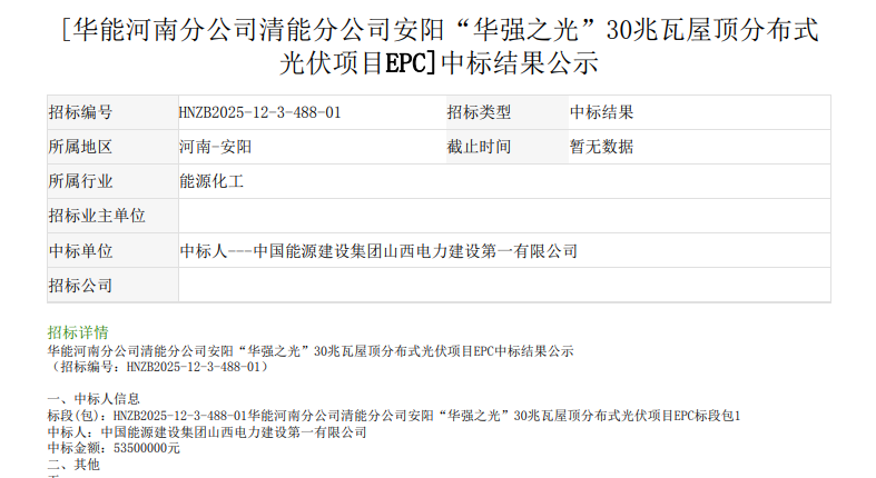 2月9日,[华能河南分公司清能分公司安阳“华强之光”30兆瓦屋顶分布式光伏项目EPC]中标结果公示,具体如下: