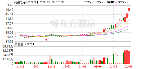 证券时报·数据宝统计显示,利通电子今日收盘价为50.61元,上涨10.00%,日换手率为19.47%,成交额为24.61亿元,全天主力资金净流入1.97亿元,近5日该股累计上涨23.02%,近5日资金合计净流入2.63亿元。(数据宝)