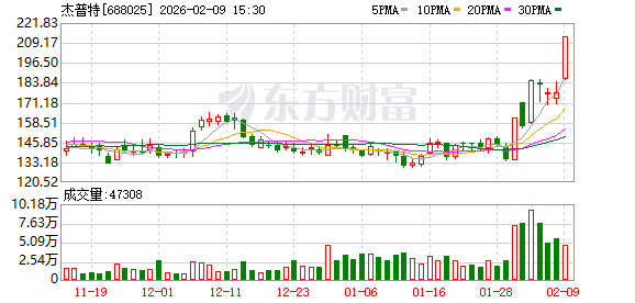 2月9日杰普特(688025)收盘价212.75元,收盘涨停,全天换手率4.98%,振幅14.99%,成交额9.49亿元。科创板交易公开信息显示,当日该股因日收盘价涨幅达15%等上榜。