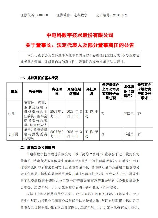 2月4日,电科数字(维权)(600850)公告称,公司董事会于近日收到公司董事长、法定代表人江波先生及董事于开勇先生的书面辞职报告。江波先生因工作变动原因申请辞去公司第十届董事会董事长、董事以及董事会战略与投资委员会主任委员、提名委员会委员职务,同时不再担任公司法定代表人。于开勇先生因工作变动原因申请辞去公司第十届董事会董事及董事会战略与投资委员会委员职务。江波先生、于开勇先生辞职后将不再担任公司任何职务。