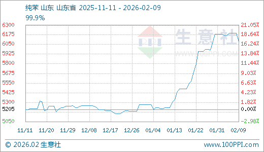 据生意社监测,纯苯02月09日最新价格6086.67元/吨,最近30天上涨16.31%。