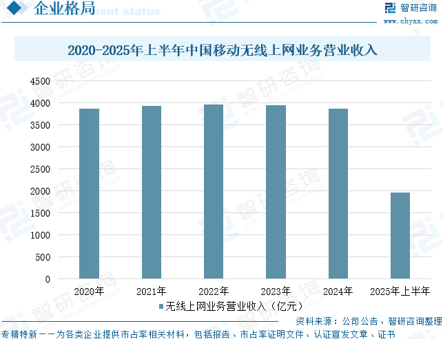 中国移动有限公司是目前中国市场上最大的移动通信运营商之一,其经营方式主要涉及无线通信和互联网服务。经过二十多年发展,中国移动已成为全球网络规模第一、客户规模第一、收入规模第一和创新能力领先、品牌价值领先、公司市值领先、盈利水平领先的通信和信息服务提供商。公司的主营业务涵盖移动语音、短彩信、无线上网、有线宽带、物联网等连接服务,数据中心、云计算、内容分发网络、算网融合等算力服务,以及基于人工智能、大数据、安全等新一代信息技术能力的平台、应用和解决方案。截至2025年6月30日,公司员工总数达45万人,移动客户总数达到10.05亿户,有线宽带客户总数达到3.23亿户。中国移动锚定“世界一流信息服务科技创新公司”发展定位,勇担科技强国、网络强国、数字中国主力军,实施“两个新型”升级计划、“BASIC6”科创计划、“AI+”行动计划,全面服务生活、生产、治理数智化转型,推动新一代信息技术深度融入经济社会民生,为社会发展和文明进步贡献更大力量。数据显示,2025年上半年,中国移动无线上网业务营业收入为1955亿元,同比下降4.68%。