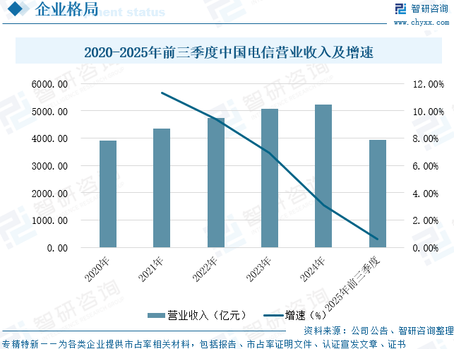 中国电信股份有限公司持续推动基础业务创新发展,加快连接提速升级,加速推进移动网络向5G-A升级、家庭宽带向千兆和FTTR升级,并不断加大直连卫星业务、量子密话密信规模拓展。加快终端融智升级,率先发布自研星小辰智能体,赋能终端升级,加快推进AI手机、AI中屏、AI摄像头等终端规模发展,积极探索AI眼镜、AI机器人等前沿领域。加快应用融智升级,不断通过AI升级推动通信助理、云盘、云电脑、视频彩铃等业务智能焕新,并推出AI文创等新智能应用;进一步升级“美好家”产品体系,让用户畅享安全家、健康家、娱乐家、低碳家、智能家等多场景智慧家庭应用。加快平台融智升级,在持续推动数字乡村、智慧社区、智慧家庭等平台融通的基础上,进一步以AI视联、AI物联为抓手,加快推进平台智能升级,推动基础业务规模与价值稳步提升。持续推进产业数字化业务创新发展,加快打造业内领先的行业大模型场景应用,累计推出80余个行业大模型、30余个行业智能体,上线星辰MaaS平台和星辰行业Agent平台,提供一体化的智能云服务,在政务、应急、工业、能源化工、住建等领域形成成熟商业模式。加快行业数字平台能力升级,围绕智慧城市、社会民生、应急安全等重点领域推出一揽子行业解决方案,120余个数字平台持续赋能各类行业客户。加快打造“5G+AI+云+应用”的5G定制网一体化产品体系,推出5G工控智能体等产品,助力客户提升生产效率、降低安全风险、提高生产质量,广泛应用于矿山、制造、电力等领域。加快打造“5个1”1创新标准ICT能力体系,提供满足中小企业客户办公及生产等通用场景的一体化解决方案,首创集全光组网、通用算力、智算于一体的算网一体化服务器,新型融合网关累计发展近50万套。从经营情况来看,2025年前三季度,中国电信营业收入为3942.7亿元,同比增长0.59%。
