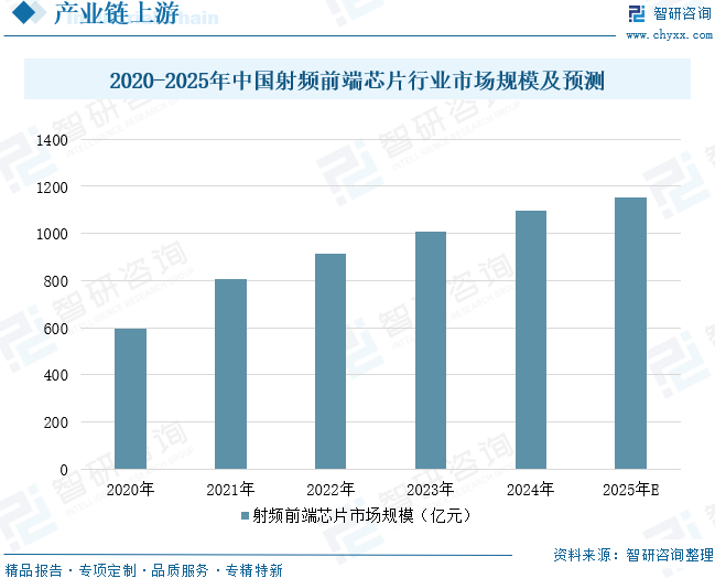 射频芯片是无线通信系统的“信号翻译官”与“传输桥梁”,核心使命是实现高频电信号的收发、调制解调与信号优化,将基带芯片处理的数字信号转化为可通过天线传输的射频信号,同时接收外部射频信号并还原为数字信号。从手机通话到卫星通信,从物联网传感到汽车雷达,所有无线连接场景的信号传输,都依赖射频芯片的精准运作。射频芯片主要分为射频前端芯片和射频收发芯片,射频前端芯片是将无线电磁波信号和二进制数字信号进行互相转化的基础部件。以射频前端芯片为例,在5G通信的推动下,中国射频前端芯片行业加速了对高频、宽带、低功耗等技术的研发,满足了新一代通信系统的需求。国内企业在射频前端芯片的设计、代工、封装等环节取得显著进展,逐步打破国际巨头的垄断局面。智能手机、平板电脑等消费电子产品的普及率提高,以及消费者对这些产品功能要求的不断提升,带动了射频前端芯片市场的发展。与此同时,汽车电子和工业无线控制等领域对射频前端芯片的需求也在持续增长,特别是在汽车的智能化、电动化和互联化趋势下,射频前端芯片在车载通信、雷达、自动驾驶等方面的应用不断增加,带动中国射频前端芯片市场规模持续增长。数据显示,2020-2024年中国射频前端芯片行业市场规模从597.5亿元增长至1097亿元,年复合增长率为16.4%。预计2025年中国射频前端芯片行业市场规模将增长至1151.9亿元。未来,随着射频前端芯片在更高频率、更宽带宽、更低功耗以及更高集成度方向持续突破,将带动射频芯片整体向多频段兼容、智能化自适应及更高能效比演进,从而驱动无线通信系统向全场景、高可靠、低时延的下一代全域智能网络全面升级。