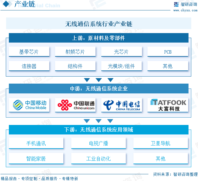 无线通信系统产业链上游为原材料和零部件,主要包括基带芯片、射频芯片、光芯片、PCB、连接器、结构件、光模块/组件等。产业链中游为无线通信系统的生产环节。产业链下游为手机通讯、电视广播、卫星导航、智能家居、工业自动化等领域。