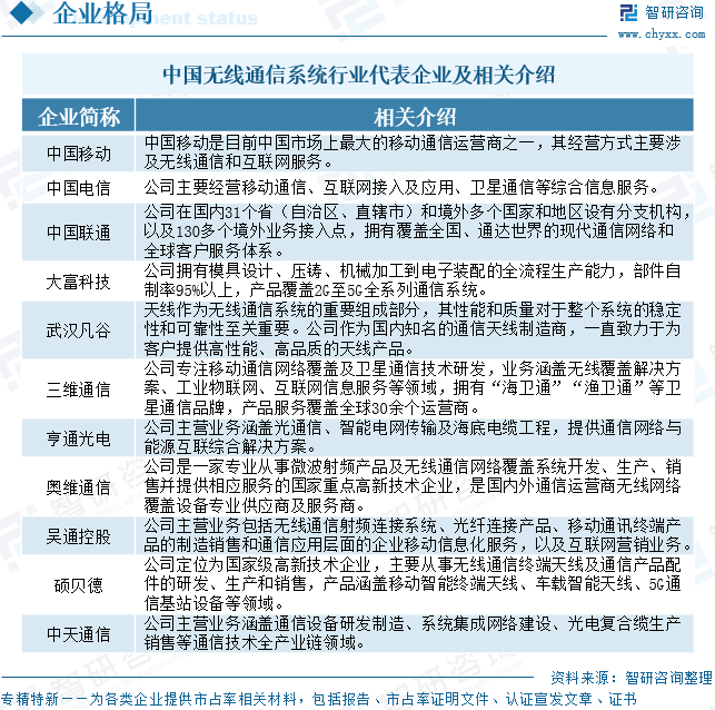 当前,中国无线通信系统行业已形成运营商主导、设备商与专业化厂商协同发展的多层次竞争格局。以中国移动、中国电信、中国联通为代表的综合电信运营商,凭借其网络覆盖、用户规模及服务整合能力,在行业生态中居于核心地位。与此同时,一批如大富科技、武汉凡谷、三维通信等在射频器件、天线、网络优化等细分领域具备技术专长的设备与解决方案提供商,正通过持续的技术创新与国产化替代,在产业链关键环节中不断巩固和提升市场份额。整体格局呈现出由规模化运营、专业化创新与产业链自主化共同驱动的动态平衡态势。