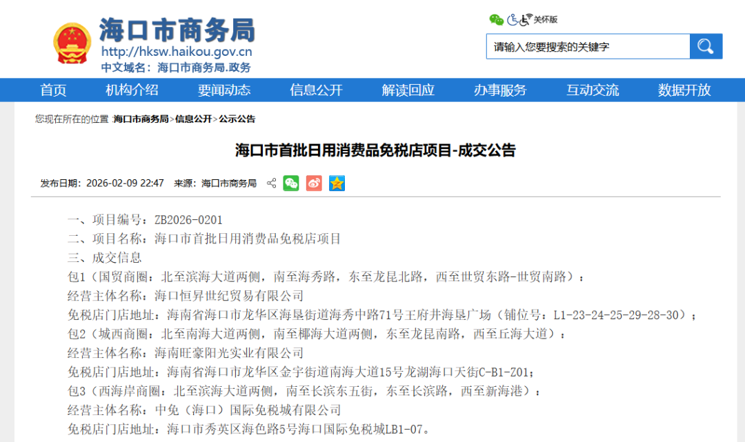 海口市商务局官网2月9日发布《海口市首批日用消费品免税店项目-成交公告》称,经竞争性谈判,海口市首批日用消费品免税店经范围、单位及具体位置已经确定。