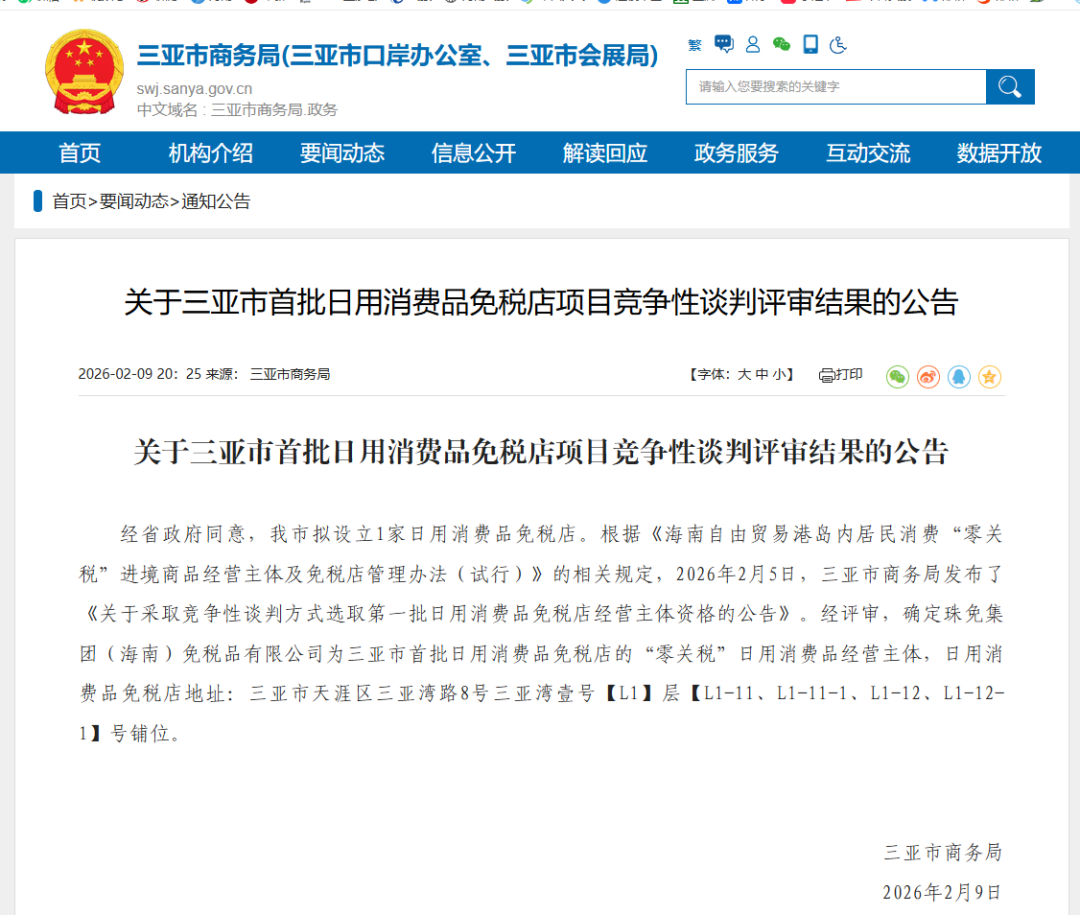 根据《海南自由贸易港岛内居民消费“零关税”进境商品经营主体及免税店管理办法(试行)》的相关规定,2026年2月5日,三亚市商务局发布了《关于采取竞争性谈判方式选取第一批日用消费品免税店经营主体资格的公告》。经评审,确定珠免集团(维权)(海南)免税品有限公司为三亚市首批日用消费品免税店的“零关税”日用消费品经营主体,日用消费品免税店地址:三亚市天涯区三亚湾路8号三亚湾壹号【L1】层【L1-11、L1-11-1、L1-12、L1-12-1】号铺位。