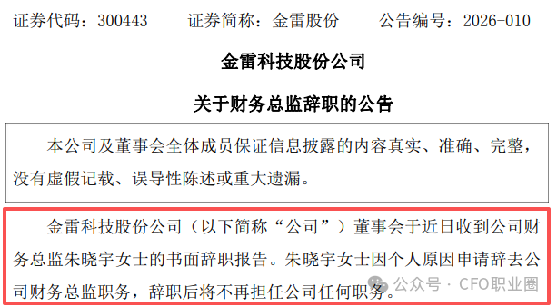 2026年2月6日,深交所创业板上市公司金雷股份(300443.SZ)发布了《关于财务总监辞职的公告》。公告显示,朱晓宇女士因个人原因申请辞去公司财务总监职务,辞职后将不再担任公司任何职务。