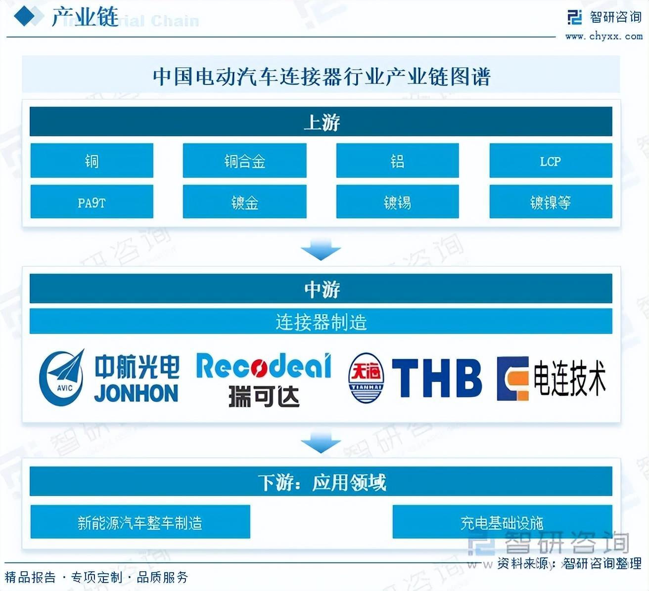 中国电动汽车连接器行业已形成结构完整、协同发展的产业链:上游是高性能铜材、特种工程塑料、电镀材料等核心原材料供应,其性能直接决定连接器的可靠性与成本,高端材料国产化是关键环节;中游为连接器制造,涵盖高压、高速、充电接口等各类产品的研发与生产;下游直接面向新能源汽车整车制造(单车用量可达600-1000个)和充电基础设施,在市场规模连续多年全球第一的强大需求驱动下,整车电动化与智能化趋势正推动整个产业链向高压化、高速化、集成化方向升级,未来增长空间广阔。