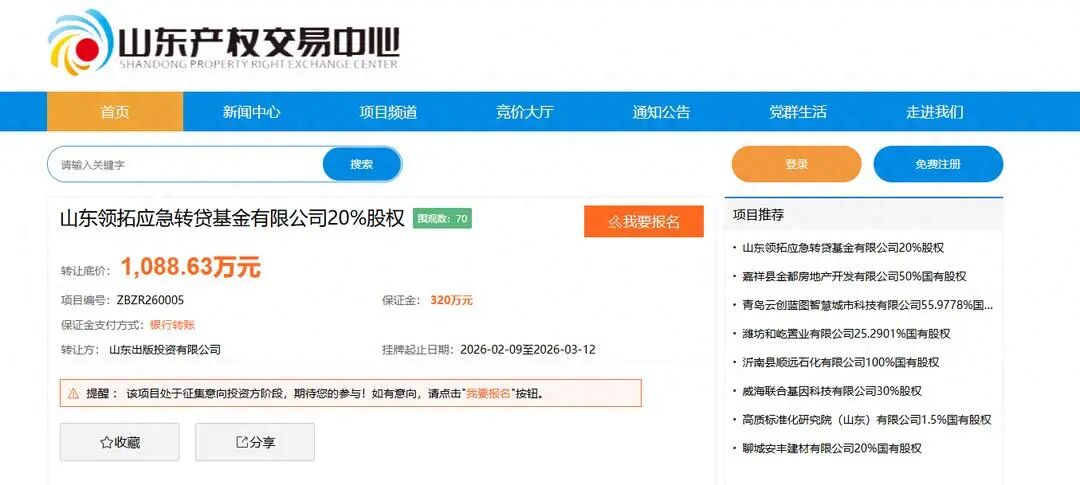 近日,山东产权交易中心官网披露一则股权挂牌转让信息,山东出版投资有限公司(下称“山东出版投资”)公开出让其持有的山东领拓应急转贷基金有限公司(下称“领拓应急转贷”)20%股权,转让底价确定为1088.63万元,挂牌起止日期为2026年2月9日至3月12日,此次转让或将成为山东出版投资优化资产结构、聚焦核心主业的重要举措。