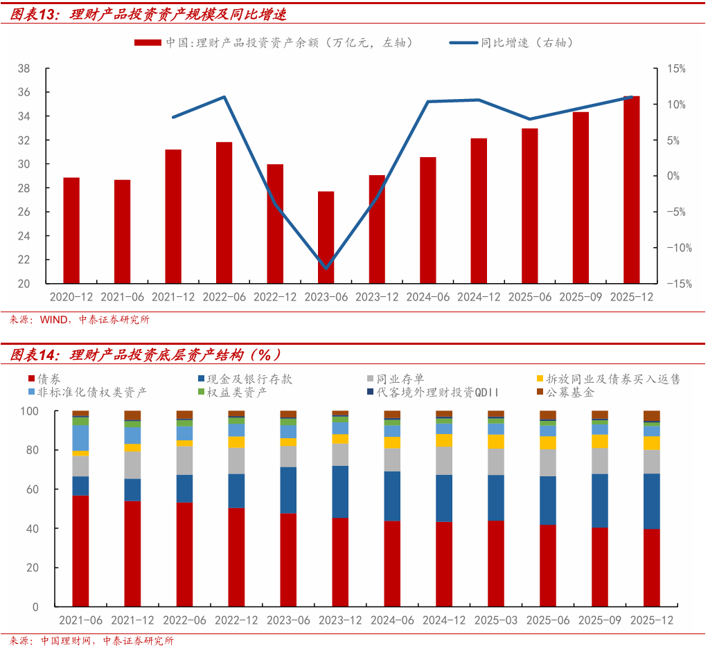 从理财产品投资资产结构来看,其资产配置仍以固定收益类资产为主,但占比下降。截至2025年末, 1)理财产品投资固定收益类资产(包含债券、同业存单、非标准化债权类资产)占比为57.03%,环比3Q25下降1.67个百分点,较之年初下降6.23个百分点,主因债券类资产占比下降,2025年末为39.73%,环比3Q25下降0.67个百分点,较之年初下降3.71个百分点。2)权益类资产占比为1.90%,环比下降0.2个百分点,较之年初下降0.68个百分点。3)现金及银行存款投资占比提升明显,2025年末为28.2%,较之年初提升4.30个百分点。