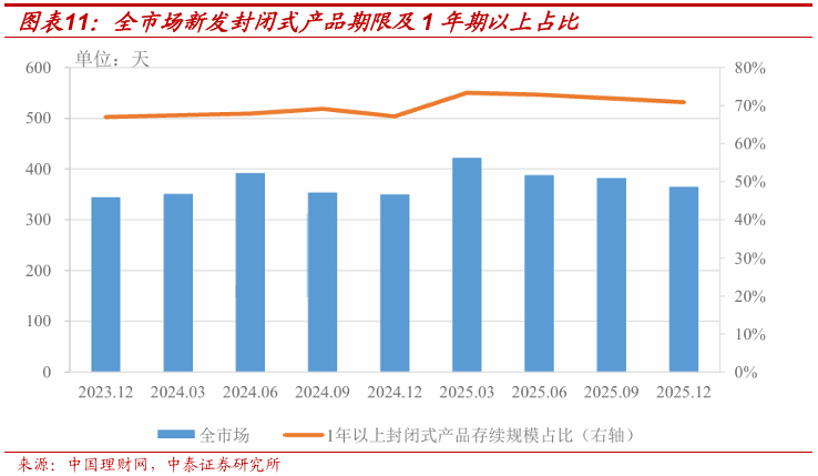 从运营模式来看,开放式理财产品仍为主力。截至2025年末为26.59万亿元,占比为79.9%,环比基本持平,其中现金管理类产品规模为7.04万亿元,占开放式理财产品规模比例为26.5%,位于2022年以来较低水平,可能与监管趋严、低利率环境下资产收益率承压等因素相关。封闭式理财产品规模为6.70万亿元,增长幅度不大,较之2020年末仅增加1.23万亿元,且4Q25单季增加0.85万亿元。从封闭式理财产品期限来看,2025年新发封闭式理财产品加权平均期限在322至489天之间,且1年期以上占比较年初增加3.72个百分点至70.87%,期限的拉长为市场提供了长期稳定的资金来源。