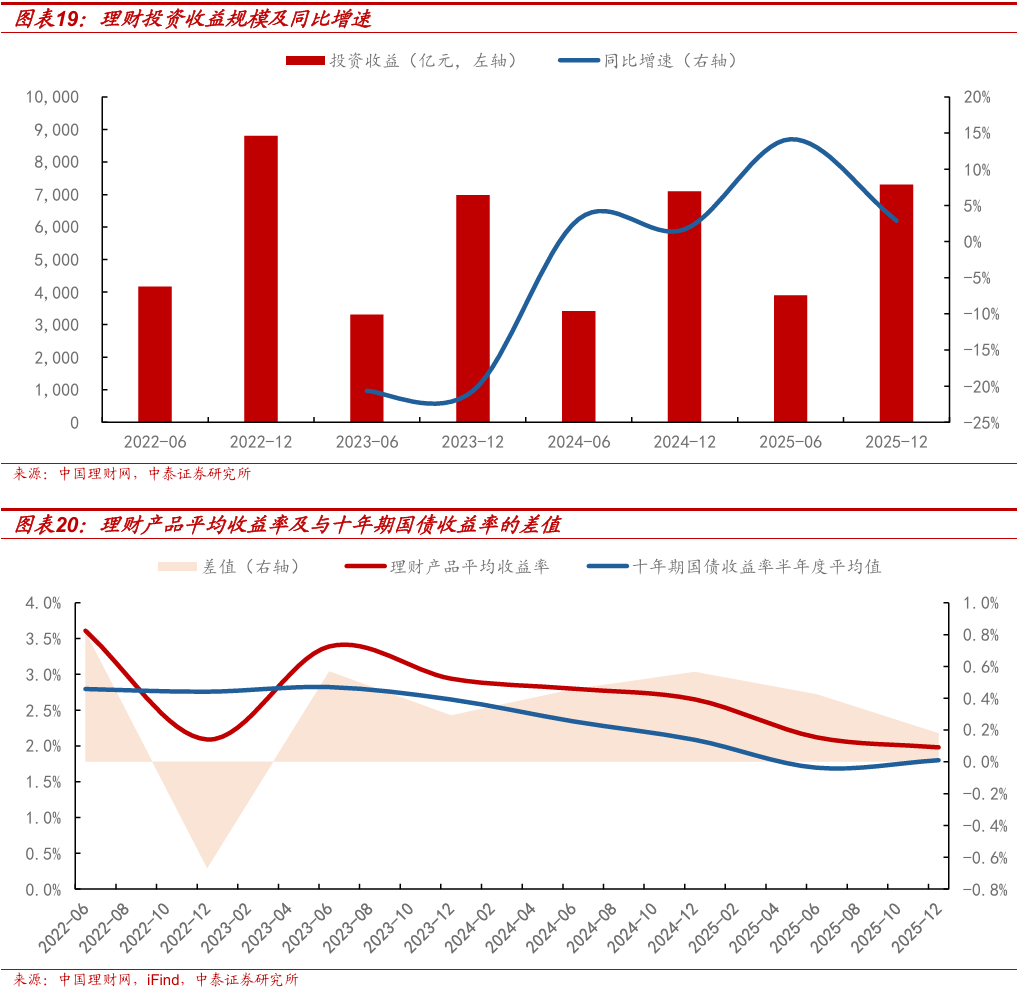 个人投资者风险偏好低,产品加权平均收益率受债市影响呈下行态势。1)截至2025年末,理财投资者数量达1.43亿人,同比增长14.4%。其中,个人投资者、机构投资者分别为14127.32、194.16万人,分别同比增长14.3%、18.8%。2)个人投资者更青睐稳健型产品,2025年末占比为33.54%。3)2024年以来投资收益回归增长区间,2025年全年实现投资收益7303亿元,同比增长2.9%,但受市场资金利率波动影响,理财产品平均收益率呈下行态势,25A为1.98%,环比1H25、24A分别下降0.14、0.67个百分点。