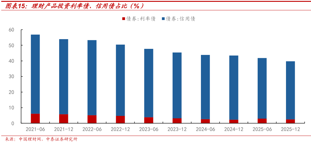 理财资金支持实体经济发展,信用债占比较高。截至2025年末,理财资金通过投资债券、非标债权、权益资产等方式支持实体经济资金规模约为21万亿元,其中债券类资产主要以信用债(包含商业性金融债券、企业债券、公司债券等)为主,2025年末占比为37.21%。
