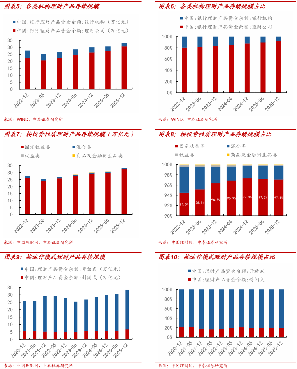 分机构类型来看,理财公司理财产品规模占比超过90%。截至2025年末,理财公司、银行机构存续规模分别为30.71万亿元、2.58万亿元,分别同比+16.72%、-29.12%,占全市场的比例分别为92.25%、7.75%,其中理财公司存续规模占比首次超过90%。