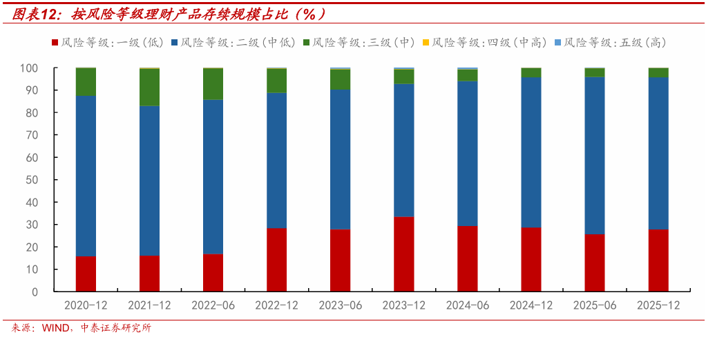 从产品投资性质来看,固定收益类产品占比高位企稳。截至2025年末,固定收益类、混合类、权益类占比分别为97.1%、2.6%、0.2%,环比1H25分别-0.1、+0.1、0.0个百分点。从更长区间来看,固定收益类产品比例较之2022年提升2.6个百分点,理财投资更倾向于低波动性。