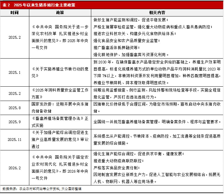2025年,生猪行业政策稳产保供主线延续,对行业运行质量和风险防控的要求持续提升。2025年以来,生猪养殖行业各项政策仍围绕贯彻落实乡村振兴精神展开,基础产能调控仍是平抑行业周期波动、稳定市场预期的核心抓手。2025年中央一号文件明确提出要“做好生猪产能监测和调控,促进平稳发展”,延续近年来以能繁母猪存栏和生产监测为基础的调控思路,持续引导生猪产能在合理区间内平稳运行,避免供需大幅失衡。2025年初农村农业部印发《关于实施养殖业节粮行动的意见》,明确了在确保畜禽产品稳定安全供给的基础上,通过提升养殖效率、优化饲料结构和加强营养管理等方式推动单位产品饲料消耗下降,从成本端改善行业盈利基础,强调通过效率提升而非恶意低价竞争等“内卷”手段实现降本,有利于促进行业高质量发展。