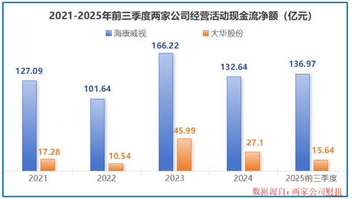 数据显示,2021至2025年前三季度,海康威视的经营活动现金流净额始终超百亿元,反观大华股份同期经营活动现金流净额均未超过50亿元,差距一目了然。
