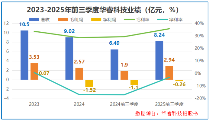 2023年华睿科技实现营收10.5亿元、净利润726万元,初步实现盈利;但2024年公司业绩突然遇挫,营收下滑至9.02亿元,净利润更是由盈转亏,亏损额达1.52亿元。