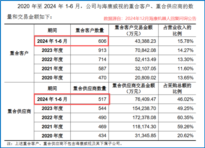 以2024年上半年为例,海康机器人与海康威视的重合客户数量为606家,重合客户交易金额占当期营收的15.78%;重合供应商为517家,交易金额占当期采购总额的46.02%。