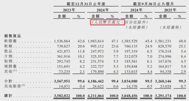 其中,2023年、2024年和2025年前三季度,软糖毛利率分别为44.7%、48.2%和46.4%,而软胶囊毛利率仅25.4%、24.6%和26.5%,使得公司整体毛利率仅29.7%、30.6%和31.5%。
