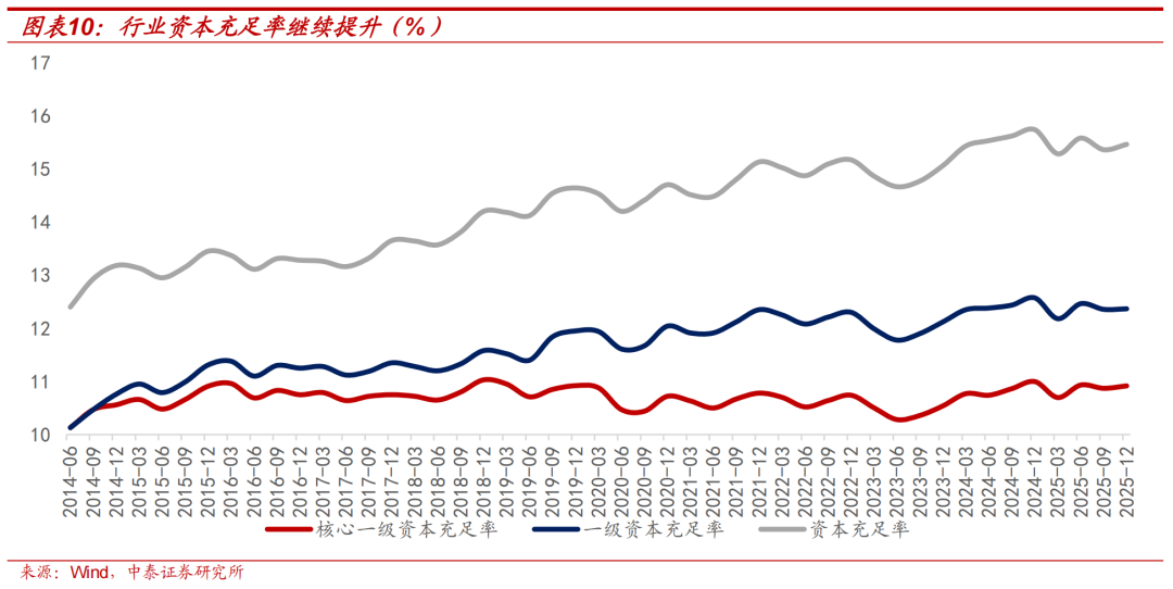 行业资本充足率有所提升。4Q25末商业银行(不含外国银行分行)核心一级资本充足率、一级资本充足率、资本充足率分别为10.92%、12.37%、15.46%,环比3Q25末+4bp、+1bp、+10bp。