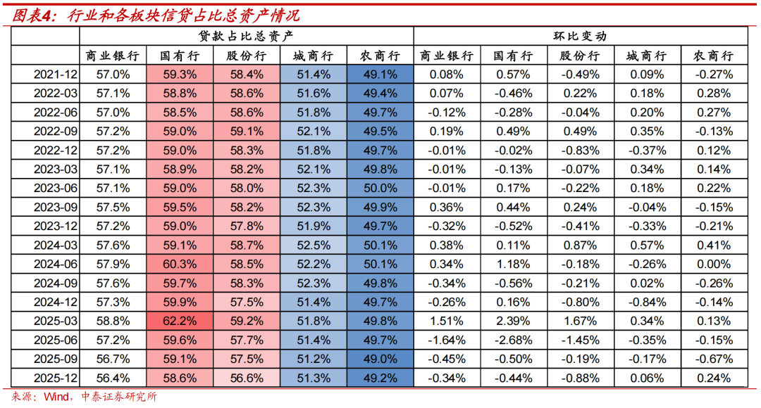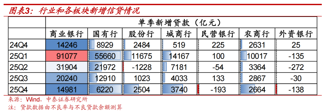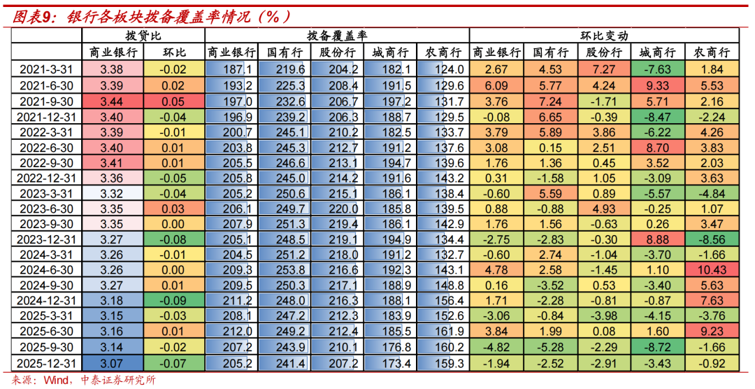 行业拨备覆盖率与拨贷比均继续下降。4Q25末,银行业整体拨备覆盖率205.2%,环比3Q25末-1.94个百分点;拨贷比3.07%,环比-7bp。