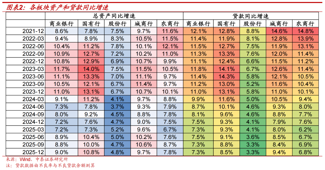 分板块看,1)国有行资产同比增速环比上升0.8个百分点至10.8%,信贷同比增速环比下降0.3个点至8.5%;单季新增信贷6220亿,同比少增2709亿。2)股份行资产同比增速环比上升0.2个百分点至4.8%,信贷同比增速环比持平在3.3%;单季新增信贷2504亿,同比多增20亿。3)城商行资产同比增速环比下降0.9个百分点至9.7%,信贷同比增速环比上升1.0个点至9.4%;单季新增信贷3740亿,同比多增3221亿。4)农商行信贷同比增速环比下降0.1个点至6.8%;单季新增信贷2664亿,同比多增33亿。(本文信贷数据由不良余额和不良率测算,增速与央行金融数据有误差。)