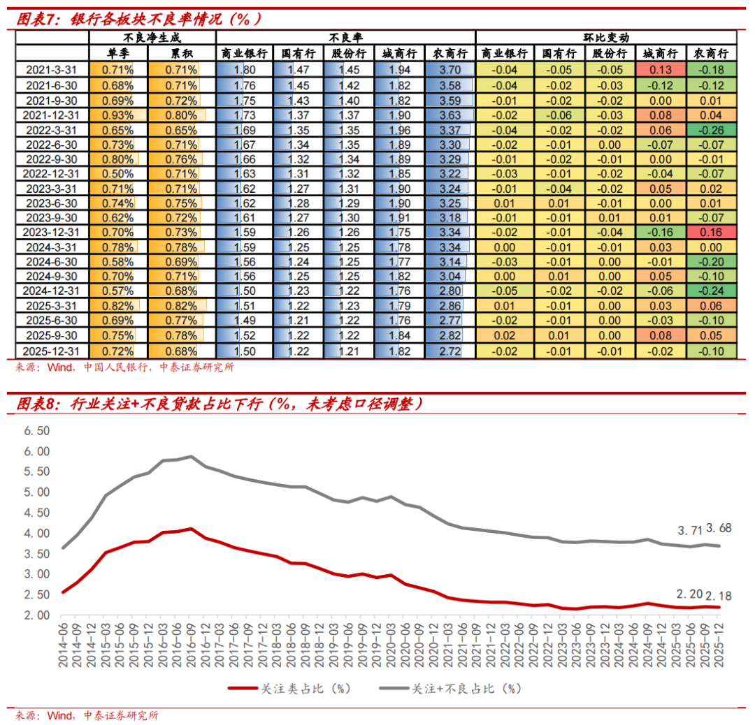 关注类贷款占比小幅下降。4Q25末关注类贷款占比为2.18%,较3Q25末变动-1bp。关注+不良贷款占比为3.68%,较3Q25末-3bp。