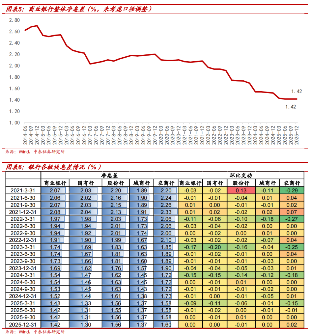 4Q25行业净息差1.42%,环比继续保持稳定。其中,国有行、股份行、城商行、农商行4Q25息差分别边际变动0bp、-1bp、0bp、+2bp至1.30%、1.56%、1.37%和1.60%。
