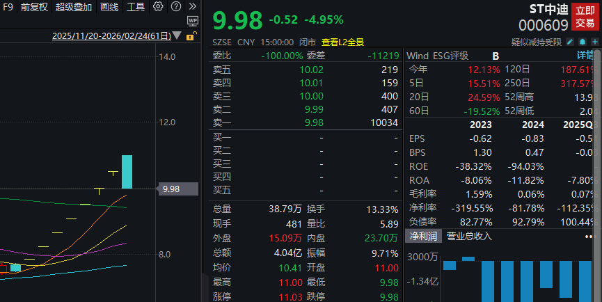 此前,ST中迪因控制权变更一事备受市场关注。对于神秘买家天微投资接盘ST中迪后的相关安排,2月12日,ST中迪发布公告称,截至公告披露日,公司控股股东天微投资不存在未来12个月内改变中迪投资主营业务或者对中迪投资主营业务作出重大调整的具体计划。与此同时,ST中迪还提醒,公司股票可能在2025年年报披露后被实施退市风险警示及继续被实施其他风险警示。