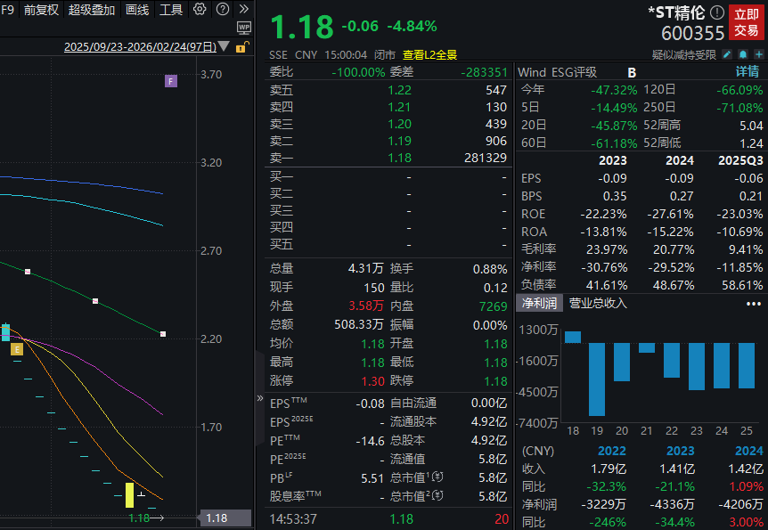 同样面临退市危机的*ST精伦(600355)则成为全市场股价最低的个股。今日,*ST精伦延续此前跌势,再收“一字”跌停。截至收盘,该股股价报1.18元/股,逼近“1元线”。2026年1月28日至今,该股13次跌停,股价累计下跌逾45%。