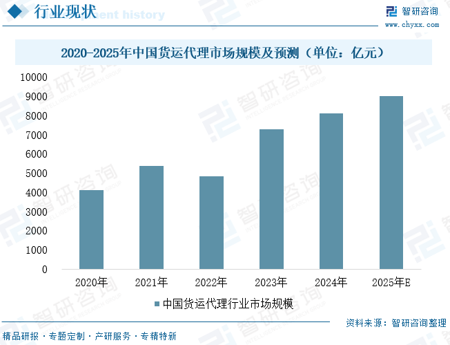 中国货运代理行业发展始终与政策导向、市场周期深度绑定,从改革开放后初步起步,到加入WTO后市场化进程全面加速,再到“十四五”现代物流规划落地、RCEP正式生效、“一带一路”倡议持续深化,一系列政策红利持续推动行业向规范化、国际化、数字化方向转型。行业发展伴随市场周期波动,2022年受国际运价高位回落、海外需求阶段性疲软,以及能源、人力等运营成本上升的多重影响,市场规模随行业周期出现阶段性回调;2023年以来,头部企业并购整合步伐加快,多式联运与跨境供应链服务加速扩容,行业集中度显著提升,叠加“一带一路”沿线贸易需求持续释放,市场规模重回稳步扩张轨道。2024年行业市场规模达到约8100亿元,展望未来,在RCEP深化实施、跨境贸易多元化发展,以及绿色物流、综合供应链服务创新的多重驱动下,行业将保持稳健增长态势,2025年市场规模有望突破9000亿元。