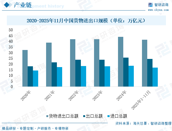 下游是货代行业的需求来源,核心分为传统制造业、跨境电商、贸易企业、其他新兴领域四大板块,需求结构的升级与分化,正倒逼货代企业从传统的“中介代理”向“综合供应链服务商”转型。其中,传统外贸企业出口是货运代理的核心服务市场,中国作为全球第一大货物贸易国,货物进出口规模持续稳步扩张,为货代行业提供了坚实的需求支撑。2025年1-11月,全国进出口总值突破41万亿元人民币,达412076.4亿元,同比增长3.6%;其中出口额244578.8亿元,同比增幅达6.2%,庞大且稳定的外贸出口规模,不仅为货代企业带来持续的业务增量,更推动其在订舱、报关、多式联运等基础服务之外,拓展供应链金融、物流方案定制等增值服务。