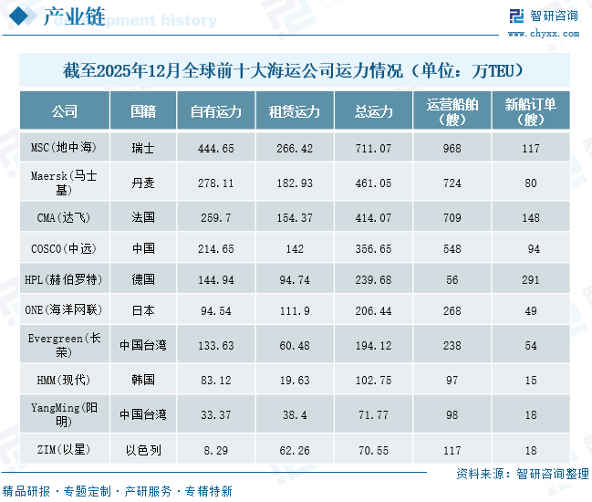 上游是货代行业的生存与发展基础,核心涵盖核心运力供给、配套服务、技术与基础设施三大板块,其供给结构稳定性与价格波动幅度,直接决定货代企业的运营成本与履约能力。运力供给体系以海运为绝对核心,空运、铁路、公路运力协同补充,构成多元支撑格局。据Alphaliner数据,截至2025年12月21日,全球在运营集装箱船共计7490艘,总运力达3361.32万TEU,总载重吨约39890.54万DWT;全球前十大海运公司总运力达2828.14万TEU,较上周增长8.25万TEU,合计占据全球84.8%的运力份额,市场集中度极高。从运力增长态势来看,前十大海运公司呈现分化格局,5家企业运力实现增长,4家出现下降,1家保持持平,头部企业的运力调整直接影响全球海运市场的供需平衡。