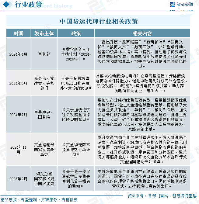 货运代理行业是国际贸易与物流产业的重要纽带,其发展与全球贸易活跃度高度相关。近年来,我国相继出台《数字商务三年行动计划(2024-2026年)》《关于拓展跨境电商出口推进海外仓建设的意见》《关于加快经济社会发展全面绿色转型的意见》《交通物流降本提质增效行动计划》《关于进一步促进航空口岸通关便利化若干措施的通知》等政策,从数字化转型、跨境电商物流配套、绿色发展转型、降本提质增效、通关流程优化等多个维度,为货运代理行业构建了全方位的政策支持体系,既推动行业加速实现电子提单普及、智能调度升级等数字化变革,也助力企业拓展海外仓布局、优化跨境电商物流服务链条,同时通过降低物流成本、简化通关手续、引导绿色运输模式,有效缓解行业同质化竞争压力,推动货运代理企业从传统的基础中介服务,向综合供应链服务商转型,为行业高质量发展注入强劲动力。