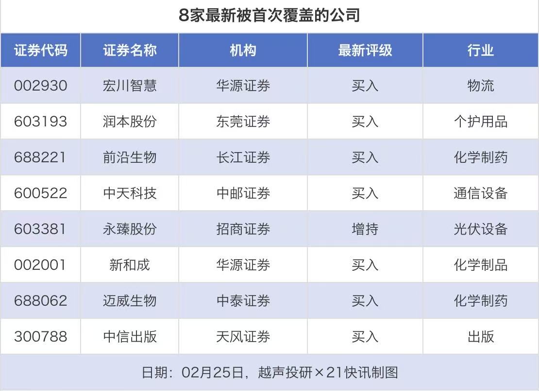 首次覆盖方面,2月25日券商共给出了8次首次覆盖,其中宏川智慧获得华源证券给予“买入”评级,润本股份获得东莞证券给予“买入”评级,前沿生物获得长江证券给予“买入”评级,中天科技获得中邮证券给予“买入”评级,永臻股份获得招商证券给予“增持”评级。