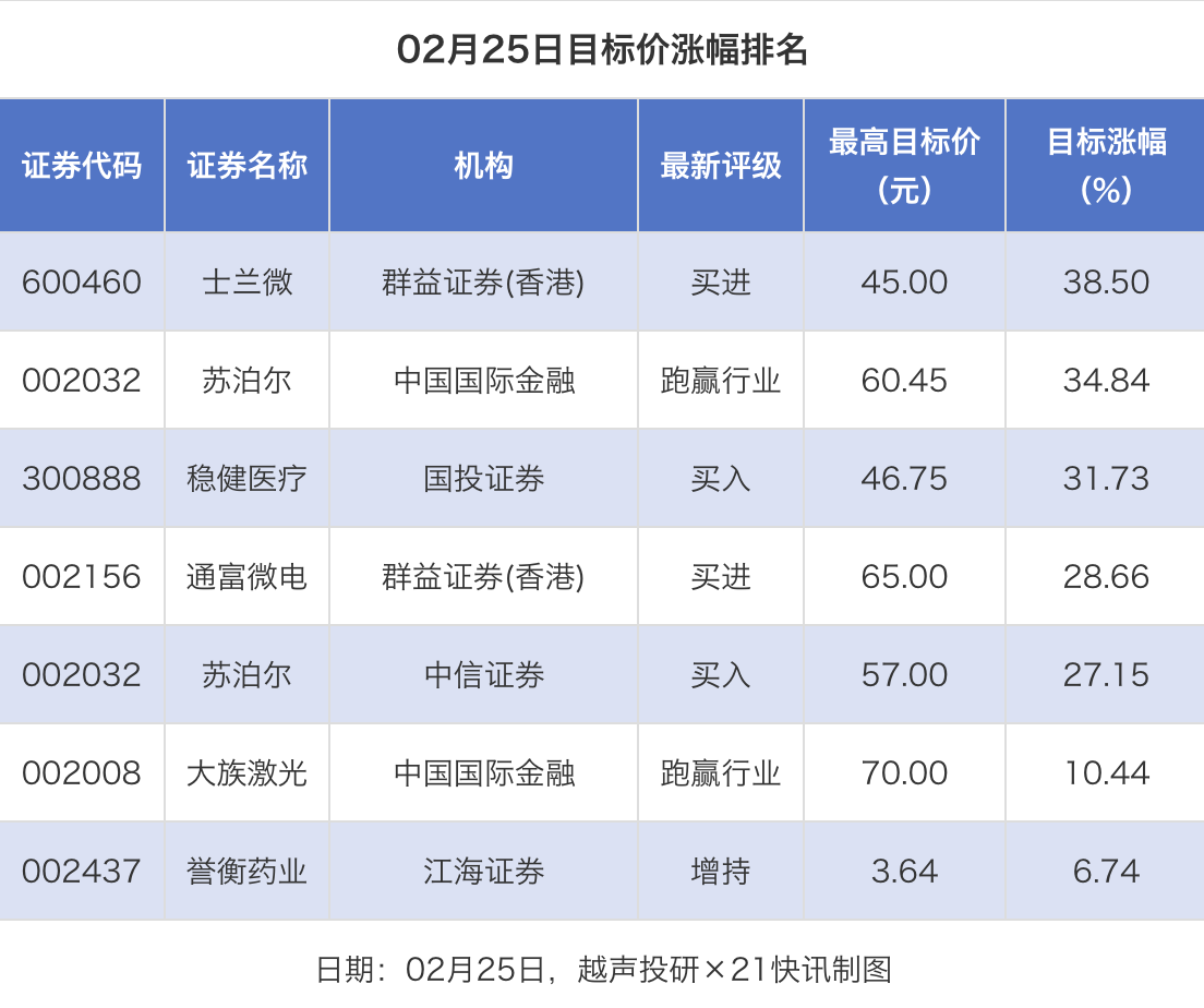 越声投研数据显示,2月25日,券商给予上市公司目标价共7次,按最新收盘价计算,目标价涨幅排名居前的公司有士兰微、苏泊尔、稳健医疗,目标价涨幅分别为38.50%、34.84%、31.73%,分别属于半导体、小家电、个护用品行业。
