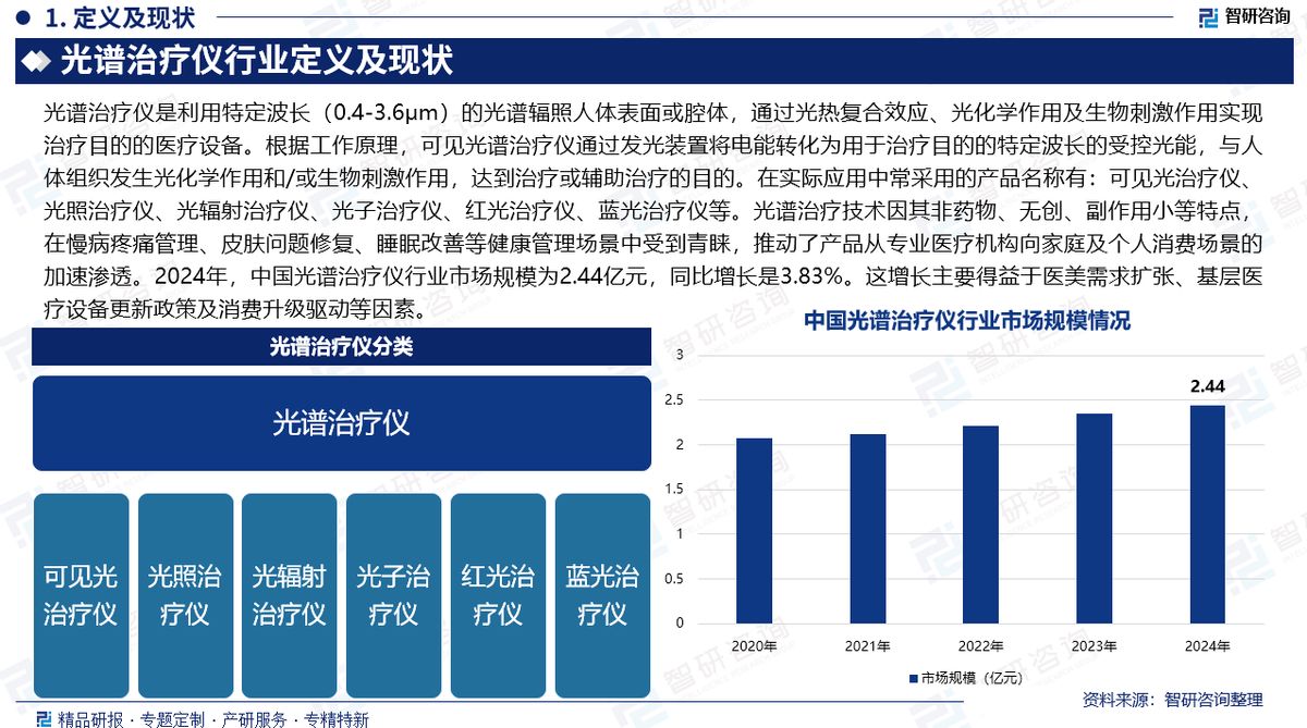 光谱治疗仪是利用特定波长(0.4-3.6μm)的光谱辐照人体表面或腔体,通过光热复合效应、光化学作用及生物刺激作用实现治疗目的的医疗设备。根据工作原理,可见光谱治疗仪通过发光装置将电能转化为用于治疗目的的特定波长的受控光能,与人体组织发生光化学作用和/或生物刺激作用,达到治疗或辅助治疗的目的。2024年,中国光谱治疗仪市场规模为2.44亿元,同比增长3.83%,增长主要得益于医美需求扩张、基层医疗设备更新政策及消费升级驱动。