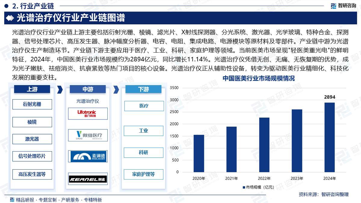 行业发展有利因素:行业增长受益于多重利好驱动。医美需求持续扩张,2024年中国医美市场规模2894亿元,同比增长11.14%,光谱治疗仪作为光子嫩肤、祛痘消炎等项目的核心设备,需求激增。基层医疗设备更新政策落地,全国基层机构加速设备升级,政策补贴推动市场渗透率提升。此外,消费升级催生家庭护理需求。技术进步方面,衍射光栅精密化演进推动波长精准度提升至±1nm,AI算法实现“千人千方”个性化治疗。